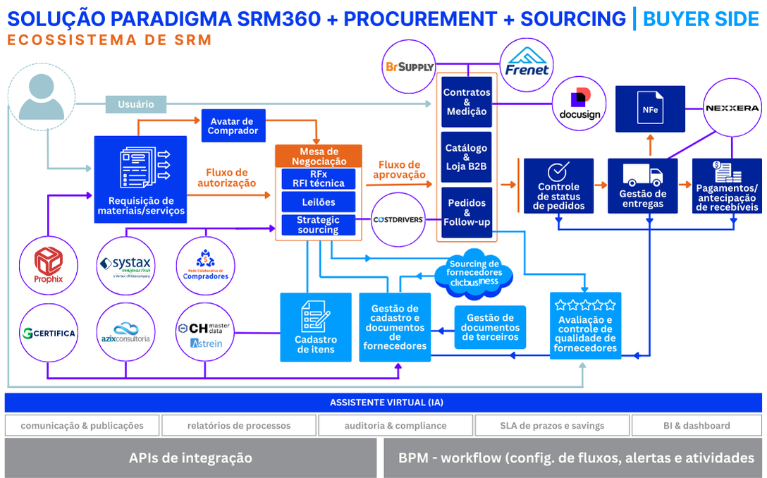 A plataforma PARADIGMA SRM360 gerencia o portal de compras que atende os processos de procurement e sourcing das empresas, e também realiza a gestão das negociações e relacionamentos com seus fornecedores.